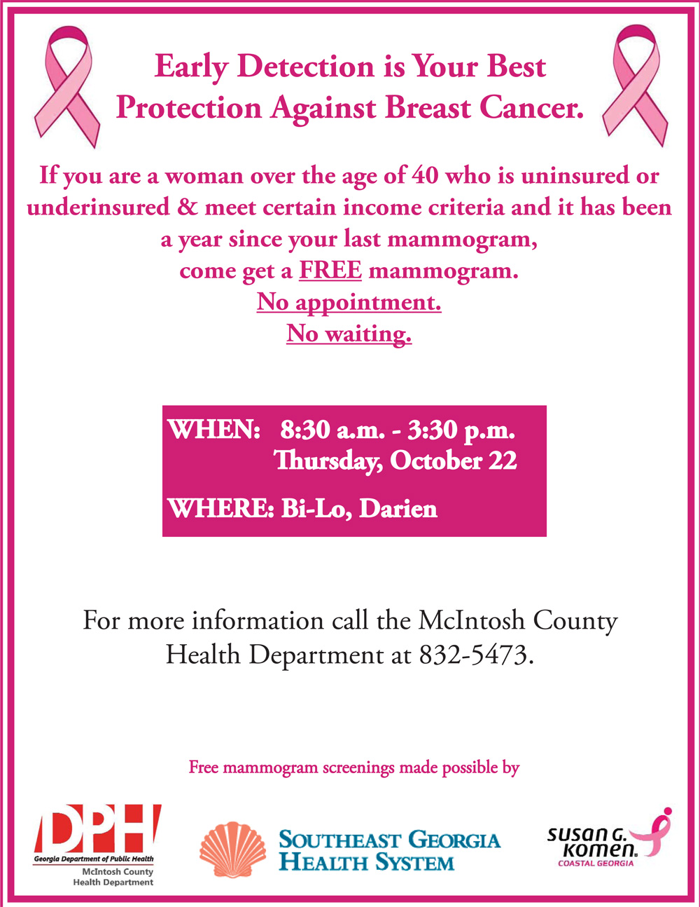For more information please call the McIntosh County Health Department at 912-832-5473.