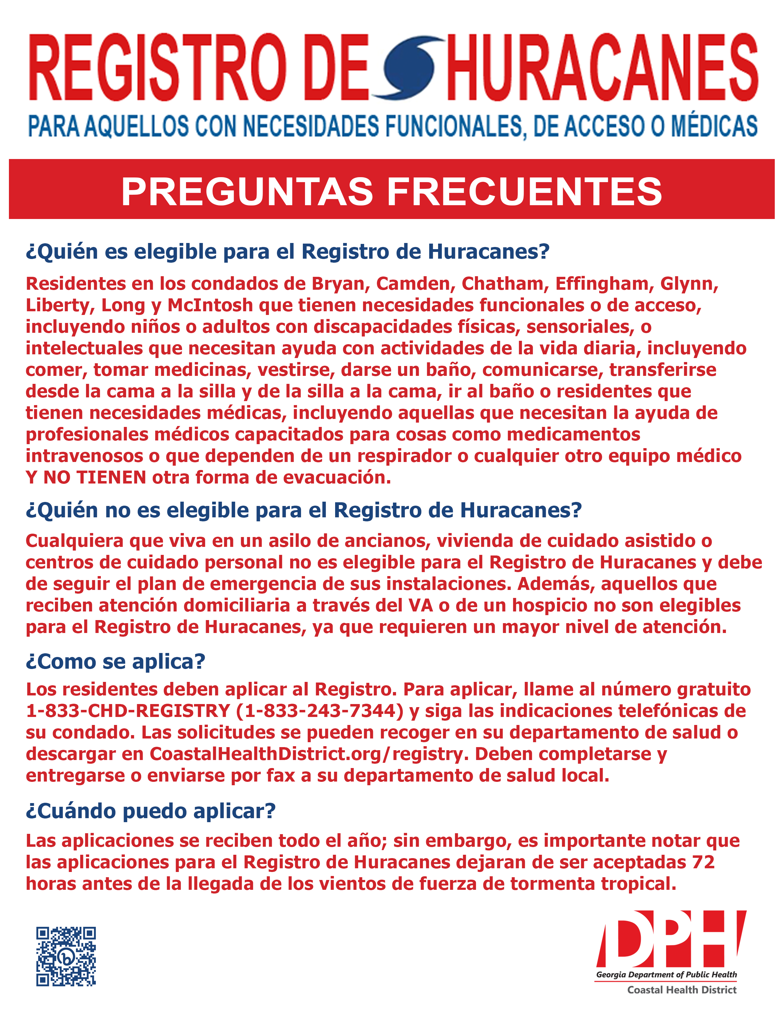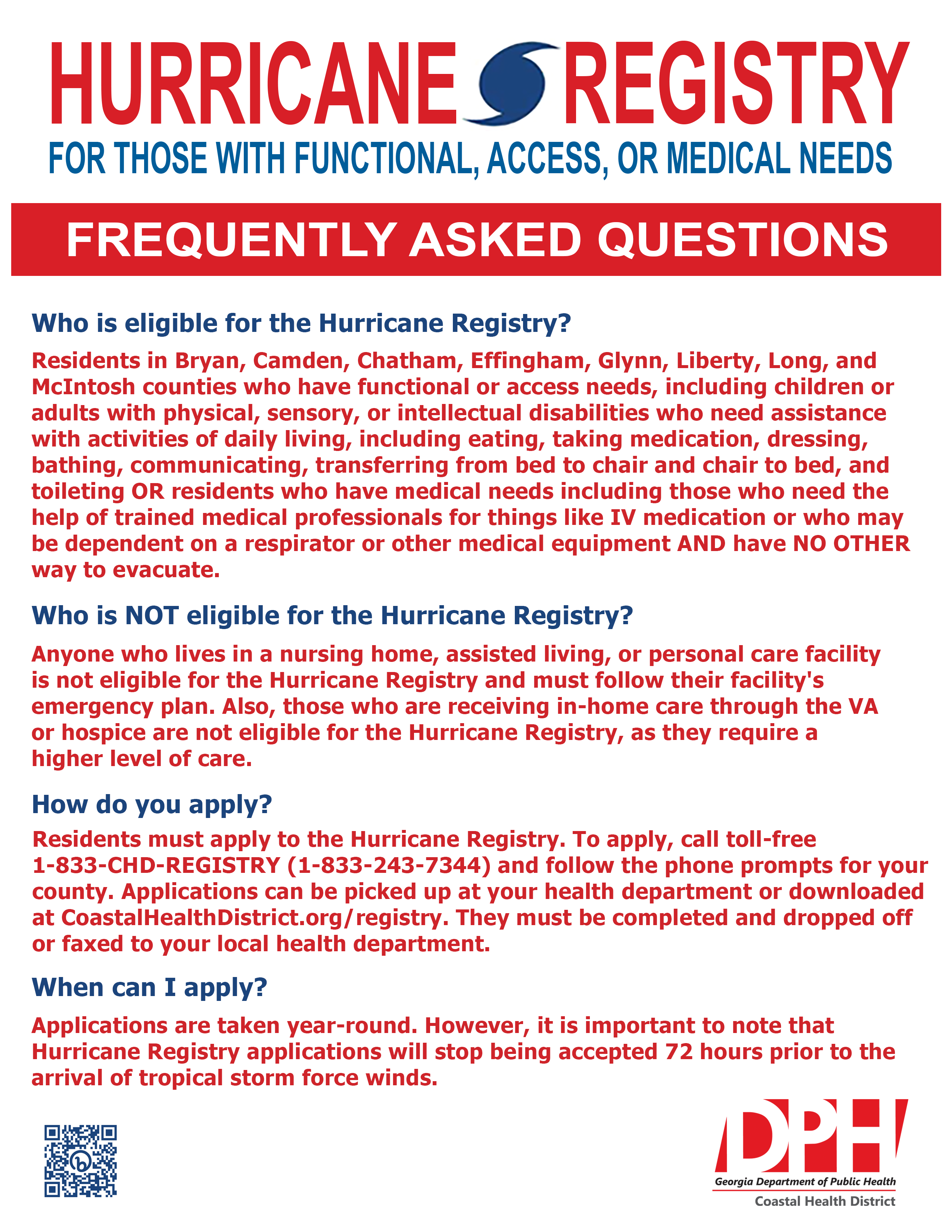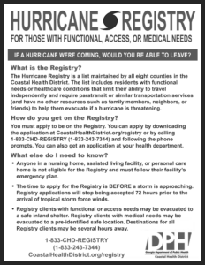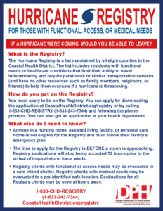 This page has additional information about the Coastal Health District Hurricane Registry, including flyers and checklists you can share with friends, neighbors, family members, church members, or anyone else who should know about this important resource.