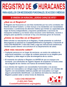 Esta página tiene información adicional sobre el Registro de Huracanes del Distrito de Salud Costera, incluidos folletos y listas de verificación que puede compartir con amigos, vecinos, familiares, miembros de la iglesia o cualquier otra persona que deba conocer este importante recurso.