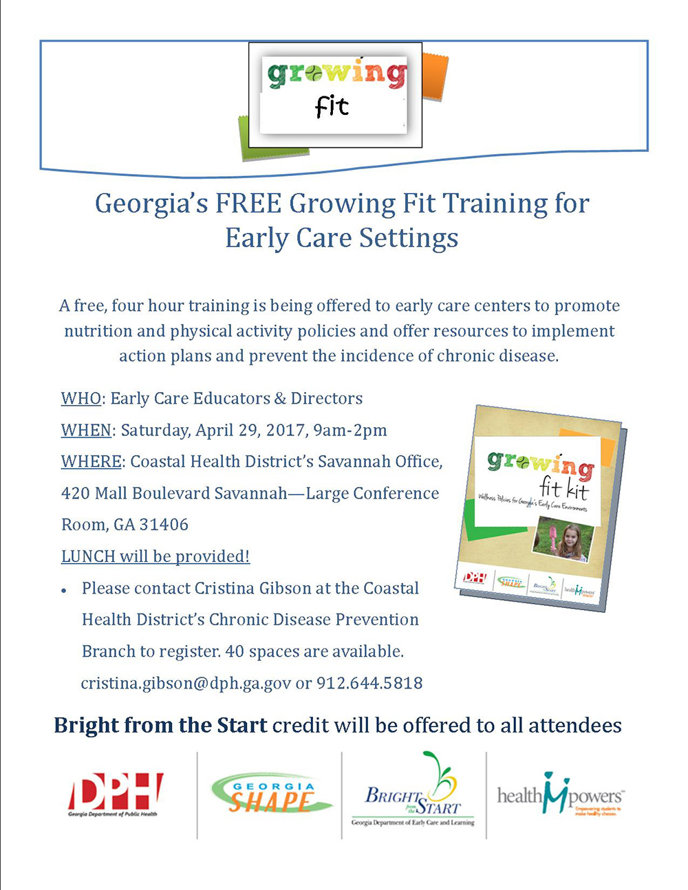 Physical activity and nutrition are essential for children to develop healthy lifestyles that will help reduce the risk of chronic disease later in life. To that end, the Georgia Department of Public Health, Georgia Shape, HealthMPowers, Inc. and Bright from the Start: Georgia Department of Early Care and Learning have developed Growing Fit Kit: Wellness Policies for Georgia’s Early Care Environment. A free training on the kit will be offered to staff from early care centers from 9 a.m. to 2 p.m. on Saturday, April 29, at the Coastal Health District office located at 420 Mall Blvd. in Savannah.