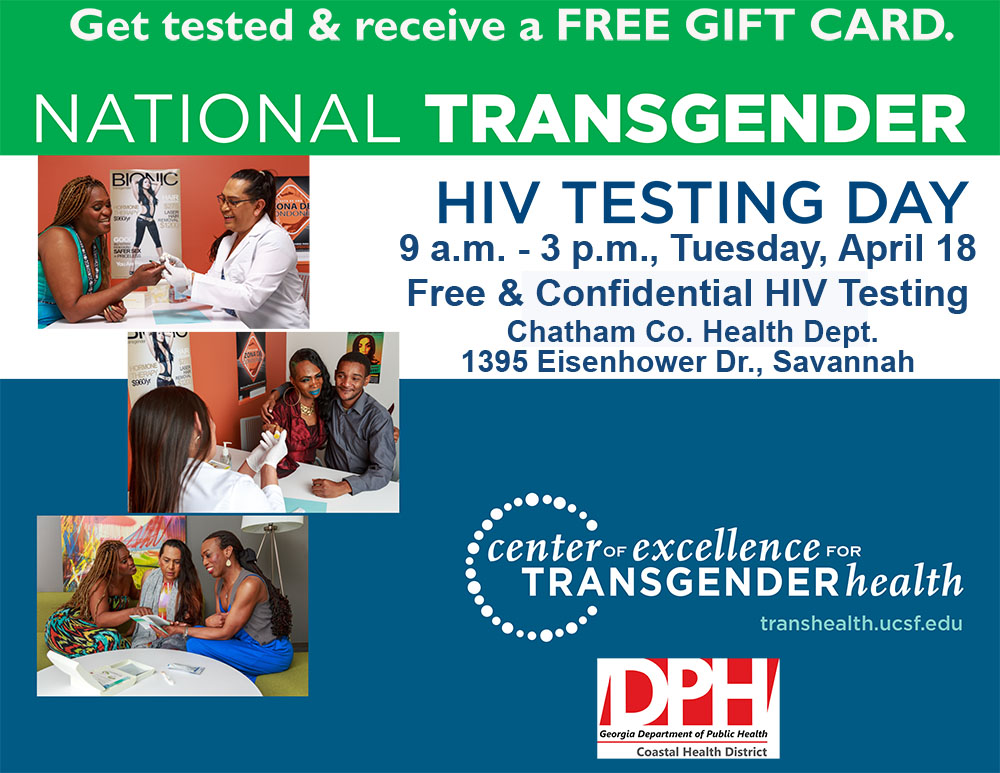 The Coastal Health District Prevention Program will offer free and confidential HIV testing event in observance of National Transgender HIV Testing Day from